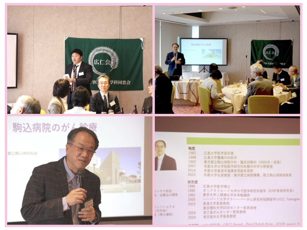 司会は幹事の一人であるH12 三嶋 弘一先生 (関東中央病院眼科部長)が行い、まず関東甲信越支部会長のS60清水 渉先生(日本医科大学循環器内科 教授)より開会のご挨拶を頂いたあと、S54 松本 万夫先生(東松山医師会病院 病院長)に乾杯のご発声で会が始まりました。しばし歓談の後、今回は都立駒込病院の院長に就任されましたS57 戸井雅和先生より「駒込病院のがん診療展望」の演題にてご講演いただきました。いずれの病院も赤字で苦しむ中、外科では最新のダビンチを複数台設置し、また、今回の演題の主たる腫瘍においては、国内随一の患者数を誇る駒込病院にて、固形癌や血液腫瘍の最先端の医療を積極的に取入れながら、病院経営を含め病院改革を行っていることのご講演となりました。またご自身の専門である乳腺外科における医学の進歩もご解説頂き、参加者一同、真剣に聞き入っていました。
